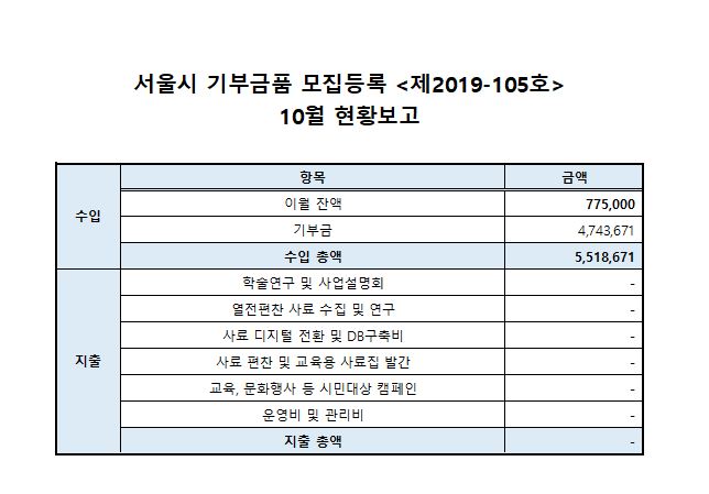 Á¦¸ñ ***¼­¿ï½Ã ±âºÎ±Ýǰ ¸ðÁýµî·Ï <Á¦2019-105È£> 10¿ù ÇöȲº¸°í