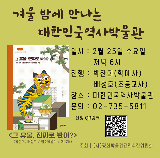 2026³â Æòȹڹ°°ü ´ä»ç ÇÁ·Î±×·¥<°Ü¿ï ¹ã¿¡ ¸¸³ª´Â ±¹¸³Áß¾Ó¹Ú¹°°ü>ÀÏÁ¤ : 2026³â 2¿ù 25ÀÏ (¼ö) ¿ÀÈÄ 6½ÃÀå¼Ò : ´ëÇѹα¹¿ª»ç¹Ú¹°°üÁøÇà : ¹ÚÂùÈñ(¹ÚÂùÈñ¹Ú¹°°ü¿¬±¸¼Ò), ¹è¼ºÈ£(Ãʵ»ç)ÁÖÃÖ : (»ç)Æòȹڹ°°ü°Ç¸³ÃßÁøÀ§¿øÈ¸Âü°¡´ë»ó : 20¸í¹®ÀÇ : 02-735-5811½Åû¸µÅ© : https://forms.gle/dsX8hcT6V2wBzXXY6* ´ä»ç Âü¿© Àü, <±× À¯¹°, ÁøÂ¥·Î ºÃ¾î?> (¹ÚÂùÈñ, ¹è¼ºÈ£ / ö¼ö¿Í¿µÈñ / 2025) Ã¥À» ÀÐ°í ¿À½Ã¸é,¹Ú¹°°ü¿¡¼ À¯¹°µéÀ» Á÷Á¢ ¸¸³¯ ¶§ ´õ¿í ±â¾ï¿¡ ³²´Â ½Ã°£ÀÌ µÇ½Ç °Å¿¹¿ä!