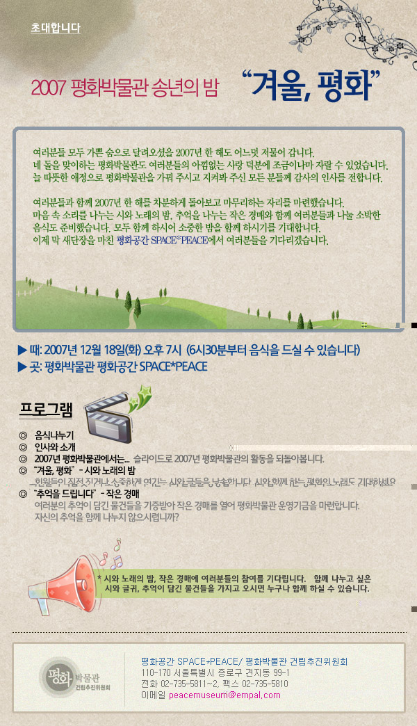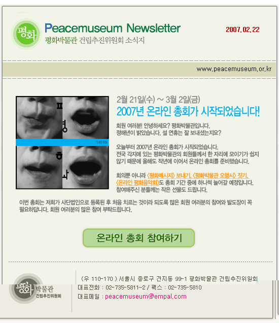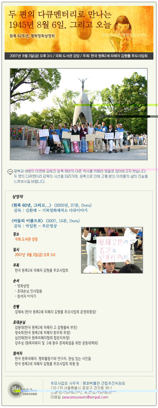 (¡Ø2005³â 1¿ù ~2006³â 4¿ù ÆòÈȼöºÐ/2007³â 1¿ùºÎÅÍ 2008³â 3¿ù±îÁö ¹ß¼ÛµÈ ´º½º·¹ÅÍ 1È£~18È£/ 2015³â peacemuseum letter´Â º» °Ô½ÃÆÇ ¸Þ´º¿¡¼ ã¾Æº¸½Ç ¼ö ÀÖ½À´Ï´Ù.)